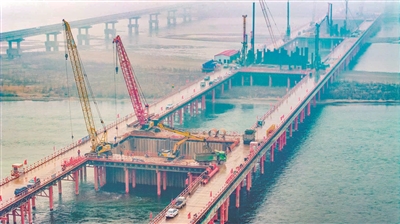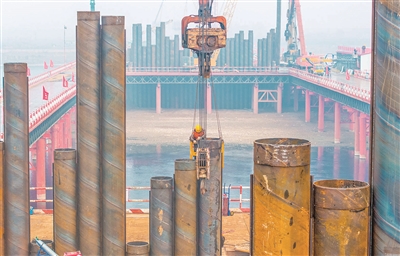 近日,在位于孟津区的洛阳黄河公铁大桥建设现场,工作人员正进行钻孔桩、承台和墩身施工。