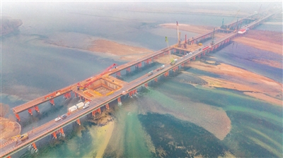 作为焦济洛平高铁核心控制性工程,洛阳黄河公铁大桥全长13.36公里,采用双层公铁两用结构,上层为208国道双向八车道,下层承载设计时速350公里的高铁轨道,合建段公路设计时速80公里。